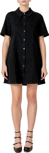 A mix of colored washes updates an A-line denim mini designed with a point collar and other Western details.