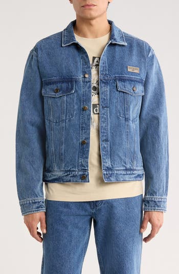 This classic denim trucker jacket is finished with a heavy wash for a lived-in feel and branded with a textured brass plaque at the chest for subtle branding.