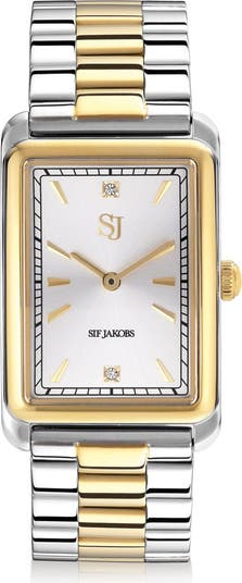Watch made of stainless steel, polished surface, with sapphire glass and white zirconia in a silver sunray dial. Water resistance 30 m. Movement Miyota.