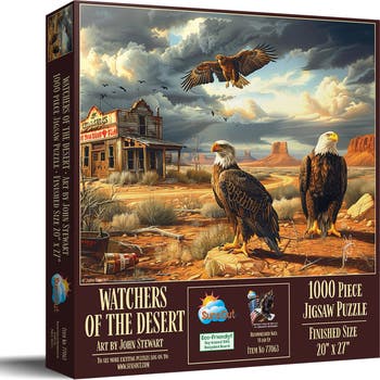 Immerse yourself in the captivating world crafted by renowned artist John Stewart with the "Watchers of the Desert" 1000 piece jigsaw puzzle. Discover a majestic desert landscape, featuring soaring eagles and rugged canyons in a 20" x 27" puzzle that not only stimulates your mind but rewards you with a breathtaking visual masterpiece upon completion. Proudly assembled with superior craftsmanship from SunsOut’s interlocking pieces, this puzzle, made from high-quality recycled cardboard, ensures durability and seamless assembly for endless enjoyment. As an added bonus, SunsOut puzzles are made in the USA with eco-friendly, soy-based inks, and the highest quality recycled board, upholding sustainability without compromising on color and sharp imagery. Your satisfaction is our top priority with our worry-free guarantee encompassing any issues with missing or damaged pieces. This puzzle also serves as a unique piece of artistic expression, being a licensed artwork from John Stewart. The vibrant hues and intricate details of the "Watchers of the Desert" will captivate your senses and elevate your puzzle-solving journey. With your purchase, you're supporting SunsOut, a proud woman-owned small business based in the USA which value quality craftsmanship and local economies. Add this puzzle to your collection to appreciate the artistry while contributing to a worthwhile cause.