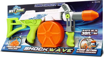 WATER BLASTER: SHOCK WAVE - Shock your friends and soak the competition with the incredible Shock Wave Water Blaster! Perfect for hot summer days, this powerful pump-action blaster delivers nonstop water-blasting fun that will keep kids and adults entertained for hours. Whether you’re having a backyard showdown, cooling off at the pool, or taking aim at the beach, the Shock Wave brings maximum soaking power to every battle! The innovative “easy action” pump design makes it simple to unleash a strong, steady stream of water with every shot—just pump, aim, and fire! The water tank easily screws on for quick refills, while its clever rotating feature lets you turn the tank 90 degrees for a cool “tommy gun” look that adds style to every soak session. With a high-capacity tank that holds up to 23.6 oz. (700 ml) of water, you’ll stay in the game longer without constant refilling. Blast water up to 30 feet (9 meters) and keep your opponents drenched and dodging! The perfect pump action water blaster toy for hot summer days that will keep your youngsters entertained for hours. It’s great for adults too! Ages 4 and up.