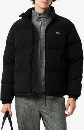 A stand collar with a stowaway hood enhances the coverage of this water-repellent puffer jacket boasting secure zip pockets and warm, lightweight down fill.
