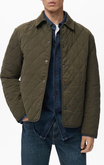 Look dashing in town and country while staying perfectly warm and dry in a diamond-quilted jacket topped by a corduroy collar and finished with handy pockets.