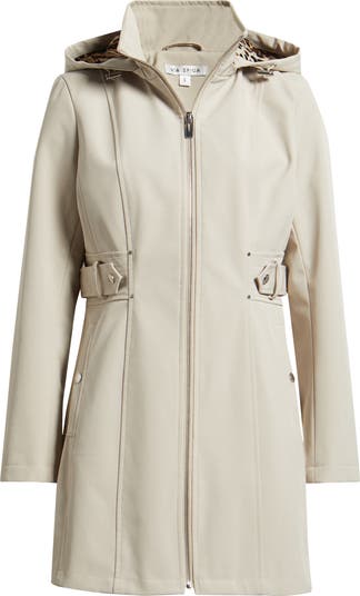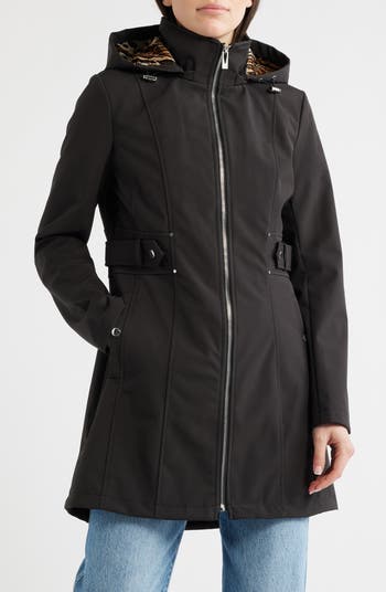 A fierce animal print lines the detachable hood of this water-shedding soft-shell coat fitted with snap-welt side pockets and a shaped, channel-stitched waistband.