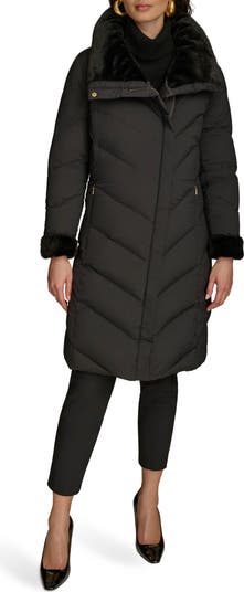 Chevron quilting streamlines the silhouette of a down puffer topped with a showy collar and cuffs lined in plush faux fur.