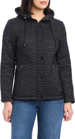 Signature spade petals enhance the whimsical appeal of a pretty floral-quilted jacket framed by a cozy hood and secure hidden-zip pockets.