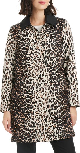 Walk on the wild side in this bold leopard-spotted raincoat cut in a playful A-line silhouette that's punctuated by an inverted back pleat and contrast trim. A removable hood makes it easy to switch up your look.