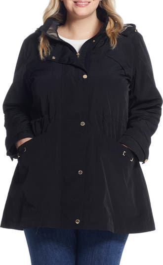Warm, water resistant and easy to wear, this rain jacket features a detachable hood and a zip-front design with sleek snap concealment.