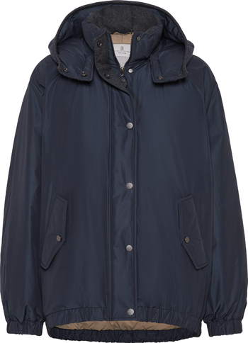 - Double closure with zip and snapsWater-resistant nylon liningDetachable hoodHand pockets with snapElastic cuffsDrawstring hemPadding made from high-quality natural materials: 90% goose down, 10% goose feathersNickel-free monili decoration