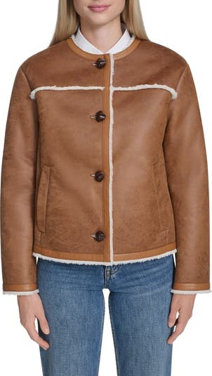 A collarless style brings a minimalist aesthetic to a faux shearling jacket buffed to a lightly lustrous waxed finish.