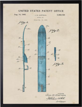 This vintage-inspired print, framed in a black wooden frame, features a water ski patent. Sized at 16 inches by 20 inches, this made in the USA frame makes for a beautiful addition to any wall.