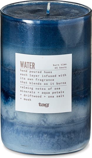 - This season, give the gift of relaxation with our Frag Fusion Water Medium Flame Pillar Candle featuring a soothing blue multi design and a generous burn time of 85 hours perfect for creating a calming ambiance in any space while its unique fragrance layers of sea minerals and driftwood invigorate the senses.