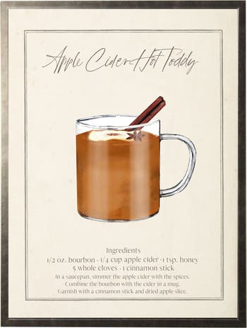 This vintage-inspired print, framed in a pewter frame, features a watercolor apple cider hot toddy cocktail and recipe. Sized at 13 inches by 17 inches, this made in the USA frame makes for a beautiful addition to any wall. Made in USA Made with real wood Hangs from back-mounted hardware Encased in glass