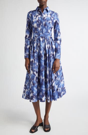 An abstract watercolor-floral print modernizes this Italian-tailored midi shirtdress in a silhouette reminiscent of the romantic style of the 1950s.