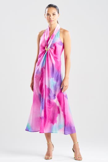 Watercolor semi sheer textured halter maxi dress with hammered brass ring. Breathable and lightweight fabrication, skimming to flatter the body. Can be worn on or off the beach.