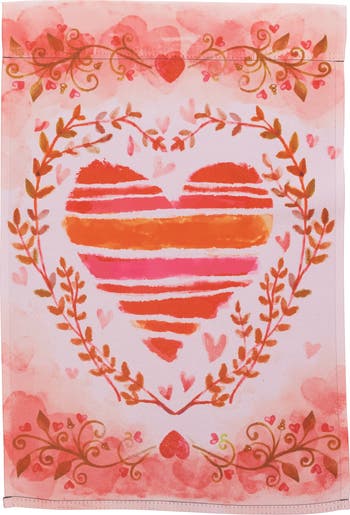 Celebrate the most heartfelt day of the year with a symbol of affection that blossoms with every gentle breeze. This garden flag features a captivating watercolor heart design in shades of radiant red and warm orange hues. Delicately adorned with intricate heart and branch accents that embrace the central heart, this flag captures the essence of love and nature intertwined. Features: Valentine's Day outdoor garden flag Watercolor heart design in red and orange hues adorned with delicate smaller hearts Branch accents encompass the heart Durable, soft and silky fabric Double-sided design Sleeve on top allows the flag to slide onto the flagpole - flagpole not included Dimensions: 18" high x 12.5" wide Material(s): polyester