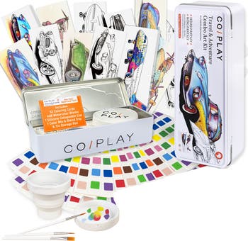 COIPLAY: TRAVEL & ADVENTURE COMBO ART KIT - Experience the enchanting world of art with the COIPlay Handmade Watercolor Art Set, where creativity knows no bounds. Perfect for artists of all skill levels, from curious beginners to seasoned creatives, this set includes everything needed for a complete artistic journey. It features 52 themed coloring cards that can be used as bookmarks, watercolor paper, 648 watercolor paint blocks, a portable cup, and premium brushes. Offering a gateway to endless imagination and relaxation. COMPACT PORTABLE DESIGN: With the size of a pencil box, the design is compact, making it an ideal choice for stress reduction, travel, and passing time. Whether as a heartfelt gift or a personal treasure, it ensures countless hours of enjoyment and artistic exploration. This ALL-INCLUSIVE MINI TRAVEL WATERCOLOR SET is lovingly designed by renowned California designer Bennie Mo, featuring mesmerizing designs. Enjoy a stylish blend of whimsy and sophistication across our various collections. ART KIT COMMITMENT TO QUALITY & ANIMAL WELFARE: COIPLAY is proud to be an official ASPCA Business Ambassador. A portion of every purchase goes toward supporting ASPCA’s mission to rescue, protect, and care for animals in need. All illustrations in our watercolor painting books are exclusively created by COIPLAY and are fully copyrighted and patented. THOUGHTFUL GIFT: This watercolor paint set for kids is not only a fun and creative gift, but also a meaningful way to support animal welfare—making it a perfect birthday or Christmas present. SAFE & NON-TOXIC: Certified by American SGS, this watercolor paint set is 100% safe and non-toxic, making it a reliable choice for kids. It’s a quality kid paint set that parents can trust, ensuring a fun for all painting experience. INCLUDES: 1 outer tin storage box, 2 coloring books with 648 integrated color blocks, 3 brushes, 1 collapsible silicone cup with lid as palette.