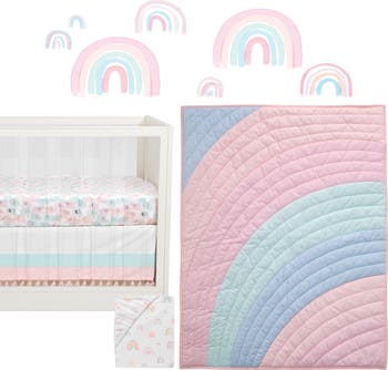 This 5-piece nursery baby crib bedding set includes one quilt, two breathable 100% cotton fitted crib sheets, one crib skirt/dust ruffle, and a complete set of wall decals. An arching rainbow of yummy pastel colors with curved quilting lines make up this beautiful pastel rainbow quilt. The quilt front is 100% cotton and is filled with soft polyester fibers. The back of the quilt is a pretty soft pink cotton-poly blend. Cute watercolor elephants on a white 100% cotton ground is one of the fitted crib sheets in the set. The other is a trendy rainbow fitted crib sheet in breathable 100% cotton and has a white ground with pastel color rainbows in a variety of sizes. It resembles a child’s hand painting style. The sheets are also sold separately. They have elastic all the way around ensuring a safe and secure fit on a standard-sized crib mattress measuring 52” X 28”. The coordinating crib skirt has a white top panel and two panels below. One panel is mint and the other is pink. A pretty tassel trim decorates the bottom. Complete this charming nursery with wall decals featuring seven watercolor rainbows with a hand-painted look. They add a designer touch to a feature wall in the nursery. This beautiful crib bedding set is a top baby registry pick and makes a wonderful baby shower gift as well.