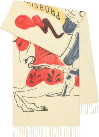 A scarf made in Italy from cashmere, printed with a seasonal Equestrian Knight Design. The hand-painted artwork playfully reimagines our house code as a watercolour and ink sketch, created as part of our Year of the Horse capsule.||Rectangular|Fringing at both ends