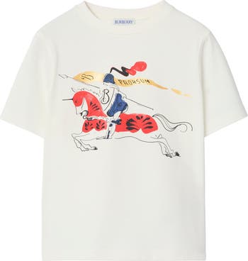 A crew-neck T-shirt in cotton jersey, printed with a seasonal Equestrian Knight Design. The hand-painted artwork playfully reimagines our house code as a watercolour and ink sketch, created as part of our Year of the Horse capsule.||Rib-knit neckline