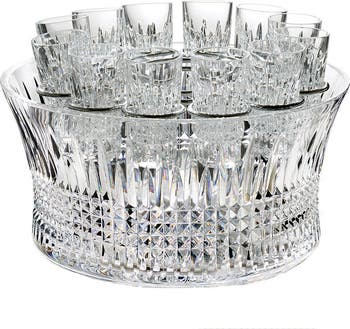Simply stunning and cut from Waterford leaded crystal, an essential ice bowl keeps spirits cold and encircled by sparkling shot glasses for seamless serving.