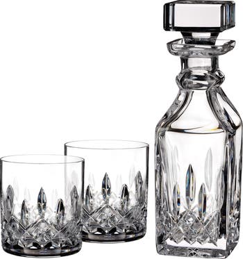 An elegant and timeless decanter and two tumblers are presented as part of the iconic Lismore collection, featuring diamond-shaped cuts that bring an air of sophistication to your drinks.