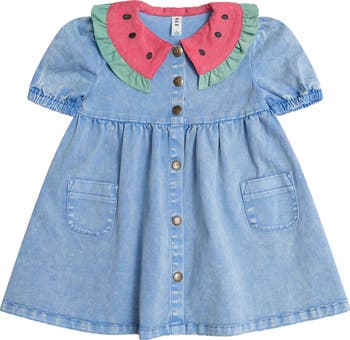 Nail the 90s look with this denim puff dress. Made from the softest denim you'll ever feel, it features puff sleeves, a delicious watermelon print collar, pockets on all sides, a full skirt and buttons for easy dressing.