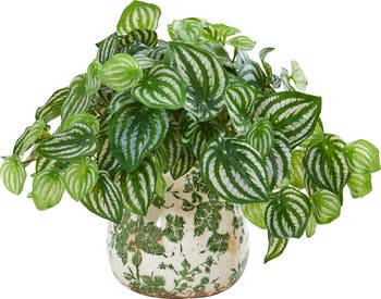 Spilling out of the included leaf printed vase, the artificial watermelon peperomia plant would make an excellent addition to a lobby or waiting area. You could place it on a small table between two beige or white armchairs to create an elegant arrangement. With a real to the touch structure, you'll be amazed by how real the variegated green foliage feels under your fingertips!