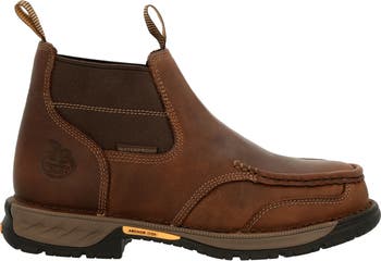 The Athens 360 steel toe waterproof Chelsea boot is designed for supreme comfort in rugged job environments. The upper is crafted from premium SPR™ leather and has twin gore panels and nylon pull loops for an easy on and customized fit. The interior on this steel toe slip on work boot is lined with a soft performance mesh material and is equipped with the Georgia Waterproof System. Our waterproofing is guaranteed to keep water and muck from seeping in when working in wet job conditions. The Comfort Core® Next Gen footbed is a removable memory foam insole featuring individual Comfort Core® pillars that flex to absorb shock and cushion with each step. The Ergo-Fit steel toe cap in this protective toe work boot is designed to match the shape of your foot allowing more room for your toes without compromising protection. It meets ASTM F2413 I/C 75 standards for protective toe footwear. The foundation of this steel toe slip on work boot includes a fiberglass shank, a cushioning EVA midsole, a TPU Anchor Disk® and our proprietary Carbo-Tec Rubber outsole with a defined heel. It meets electrical hazard standards as outlined by ASTM F2413. The construction on this work boot is a 360-degree stich out with Cupsole and has a reinforced toe stitch to prevent sole separation.