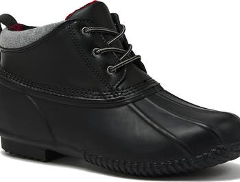 We took the classic waterproof low duck boot and winterized the inside with a soft and warm flannel lining plus a 400-gram insulated foam sock padding for even more comfort so you can stay warm and dry even in the nastiest winter weather. Slip on the perfect waterproof ankle boot for hiking trails, rainy days or taking a wet or snowy walk with your trusty pup. Our Waterproof Ankle Duck Boot also features a water-resistant upper as well as a shorter ankle height that requires less time to put on and take off. Use the durable pull-tab, tie the nylon laces for a personalized fit and off you go. The gusseted tongue prevents winter ice, snow and muck from entering the shoe while keeping the tongue securely in place. Choose from two colors: Black and Hazelnut/Dark Brown.