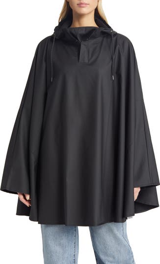A flowy waterproof cape is a modern take on the classic rain poncho, modified for cyclists and an active lifestyle. The design features a loose, billowing silhouette with a snap-fastened half-placket. Optional sleeves can be created through snap fastenings, and thumb loops ensure a secure fit even during cycle commutes.