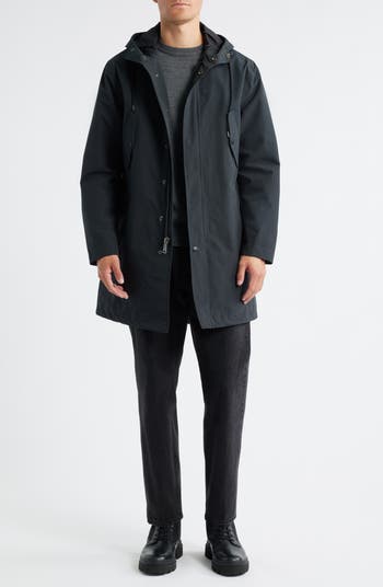 Layer on this weatherproof raincoat boasting a sporty snap storm placket, handy pockets and adjustable drawstrings at the hood and hem.