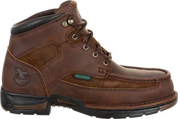 Georgia Athens Waterproof Work Shoe gives you extreme comfort and stability while keeping feet dry.Part of the Athens Collection, this shoe features Anchor Disk Technology to anchor your foot in comfort and stability. The TPU stabilizer with built-in shank is layered between materials to absorb shock and provide additional support and comfort in the areas that need it most. Added comfort comes from the Georgia Boot's AMP (advanced memory polyurethane) insole. It's a unique dual layer of polyurethane on the bottom layer for maximum cushioning and a memory foam top layer to ensure the boot's insole is custom Shaped to your foot. Built with the Georgia Waterproof System, this shoe stands up to rain and mud. Air gets in, but water can't. There's a 100 percent guarantee that your feet stay dry. The rubber outsole resists chemicals, oils and slips while remaining flexible and cushioning. Made of soft, waterproof brown leather, this 6 lace-up, moc-toe has a padded collar and tongue.