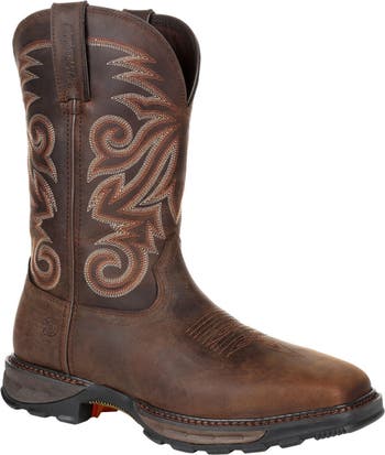 This is the men's 11" Burly Brown Waterproof Steel Toe Durango Maverick XP. This style is full-grain leather with a waterproof membrane bootie construction to keep your feet dry all day long. It features a soft mesh lining, the Durango X-Pand System which is a hidden gore expansion on the inside medial seam for a universal fit and easy on/off and the Durango X-Treme Comfort footed with Memory Foam for all day comfort and support. It has a fiberglass shank for lightweight stability and a dual-density midsole with firmer shock absorbing heel for added stability and a soft shock absorbing forepart for ultimate flexibility and comfort. The rolled shank area and anti-torsion ridged external shank provides added lateral stability and the outsole is a multi-durometer rubber with high abrasion outer lugs for high impact durability and softer durometer mid lugs for added flexibility and increased heat, slip and oil resistance. This style has a double row sole stich around the square toe for added durability and a 1 ½" rocker heel. Break ground in this men's 11" Burly Brown Waterproof Steel Toe Durango Maverick XP style. Get a pair today.