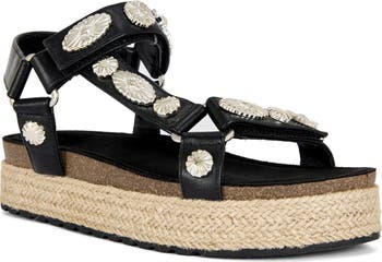 Decorative studs shimmer and shine on this ankle-strap sandal set on an espadrille-inspired platform sole with braided trim.