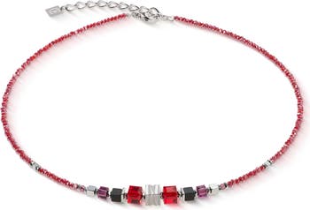 An architecturally crafted stainless steel wave cube shines at the centre of this necklace, artfully framed by deep red Swarovski crystals, onyx cubes and shiny hematite. The design flows softly into a line of fine, sparkling glass beads that make the red colour shine vividly. Expressive, refined and clear - a piece of jewellery with character, handmade in Germany by COEUR DE LION.