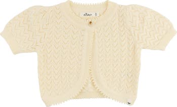 Get ready to dress your little lady in style with the oh baby! Wave Stitch Juliet Pointelle Short Sleeve Cardigan in a buttery hue. Perfect for the summer and special occasions, this cardigan adds a touch of elegance to any outfit. Available in infant, toddler and girls sizes. Designed in Minnesota.
