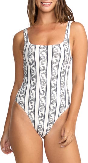 Seek out the surf in this flirty one-piece swimsuit with skimpy back coverage and a wavy pattern.