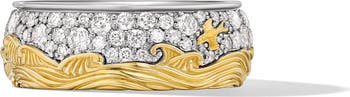 Waves of gleaming 18-karat gold are sculpted beneath a sky of brilliant pavé diamonds on this scenic band ring set in sterling silver.