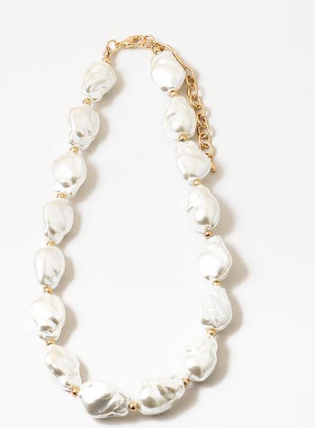 A strand of oversized, sculpted pearls with beautiful organic curves, accented by tiny gold beads for a touch of warmth. Lightweight, luminous, and effortlessly elegant—this piece adds instant polish to any outfit.