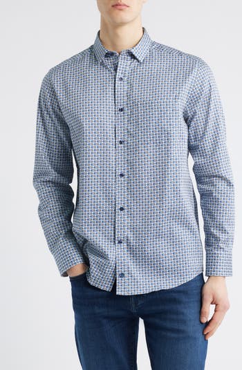 A neat diamond print enhances the classic good looks of this button-up sport shirt crafted from a smooth cotton sateen.