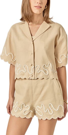 Wavy stitching adds texture and charm to this lightweight linen shirt cut in a boxy cropped fit and accented with a crisp inverted back pleat.