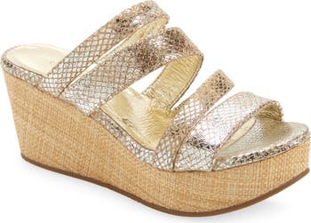 Snake-embossed metallic straps shine atop a sunny-day slide sandal boosted by a raffia-wrapped platform and integrated wedge heel.