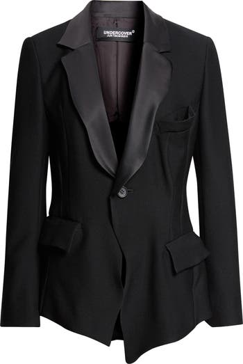 This wool stretch-twill jacket shown on the spring '26 runway is sculpted with wavy, uneven lines at the placket and hem for a mismatched effect, while sateen adds sheen to the collar and lapels for a formal yet unkempt look.
