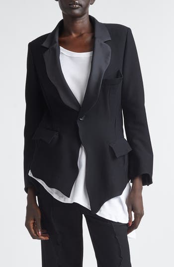 This wool stretch-twill jacket shown on the spring '26 runway is sculpted with wavy, uneven lines at the placket and hem for a mismatched effect, while sateen adds sheen to the collar and lapels for a formal yet unkempt look.