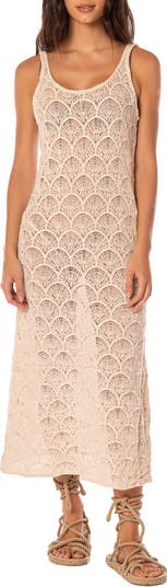Elevate your beachside look with this breezy cover-up dress designed in seashell-inspired crochet with a scoop neck and low back.