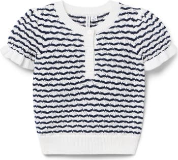 A cozy sweater top that's just our stripe. In allover pointelle with wavy stripe details, puff sleeves and ruffle cuffs.