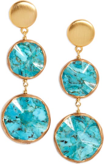 Undulate turquoise inlays lend organic color to these statement-sized drop earrings anchored with hand-etched discs.