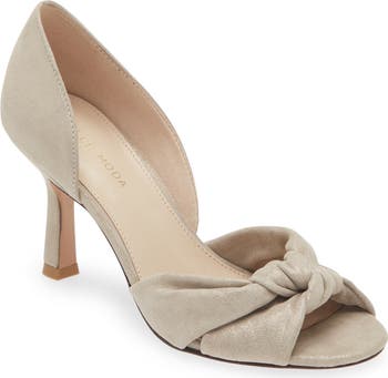 A tastefully knotted upper secures the style of an open-toe pump crafted from velvety suede.
