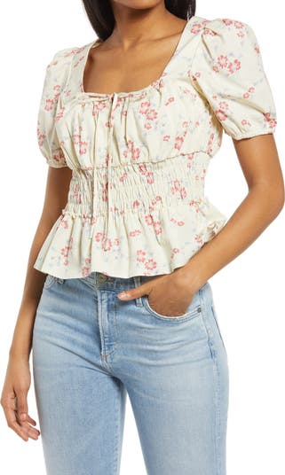 Sweetness (and a touch of swagger) define this flower-powered top shaped with smocking and puffed sleeves and fastened with an edgy exposed zipper in back.
